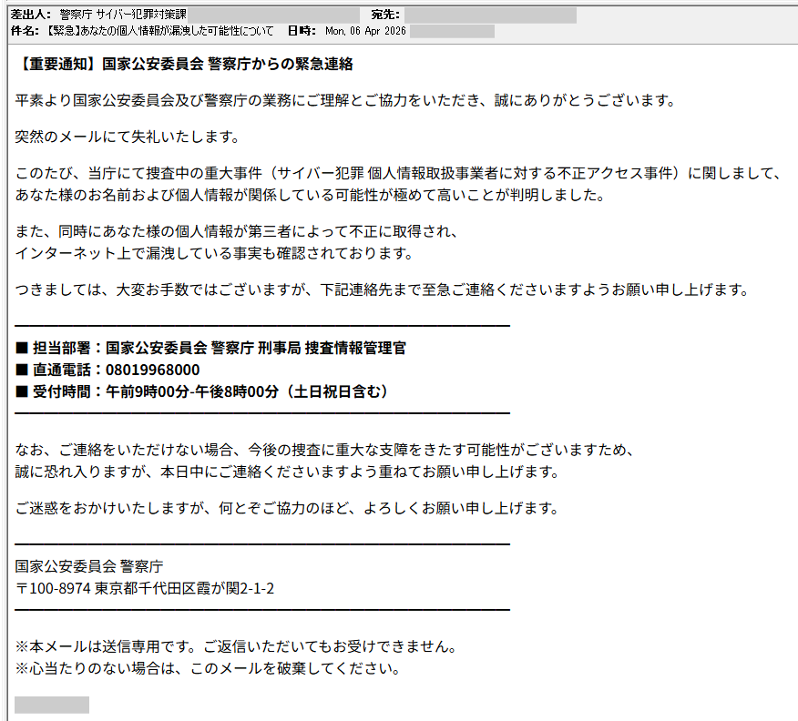 「【緊急】あなたの個人情報が漏洩した可能性について」という件名で届く、警察を騙った詐欺メール。