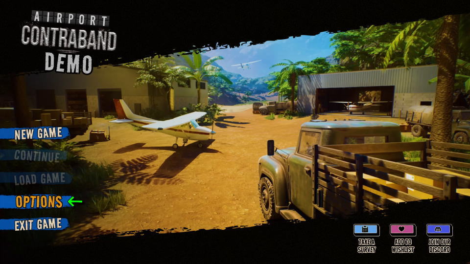 Airport Contrabandの言語を変更するには、タイトルメニューから「OPTIONS」に進みます。