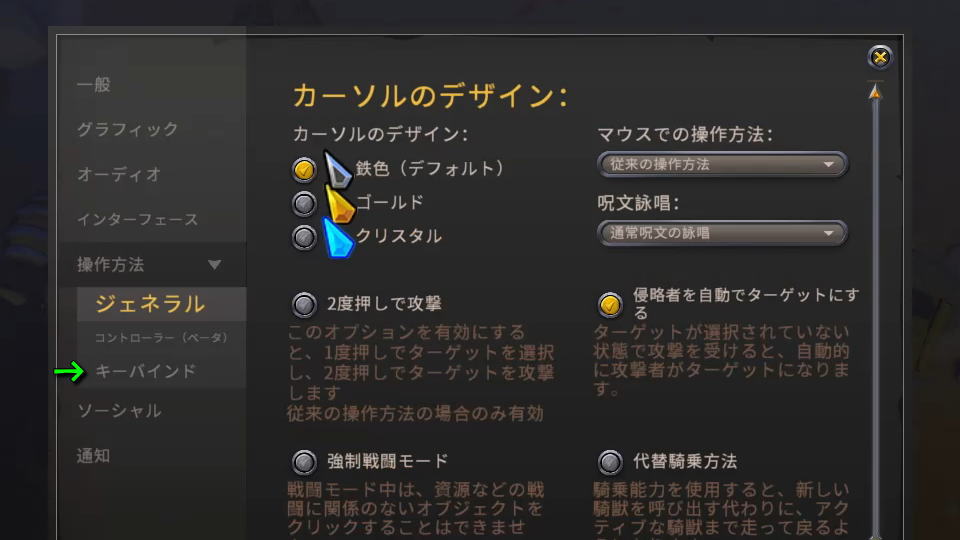 操作方法のツリーが展開したら「キーバインド」を選択します。