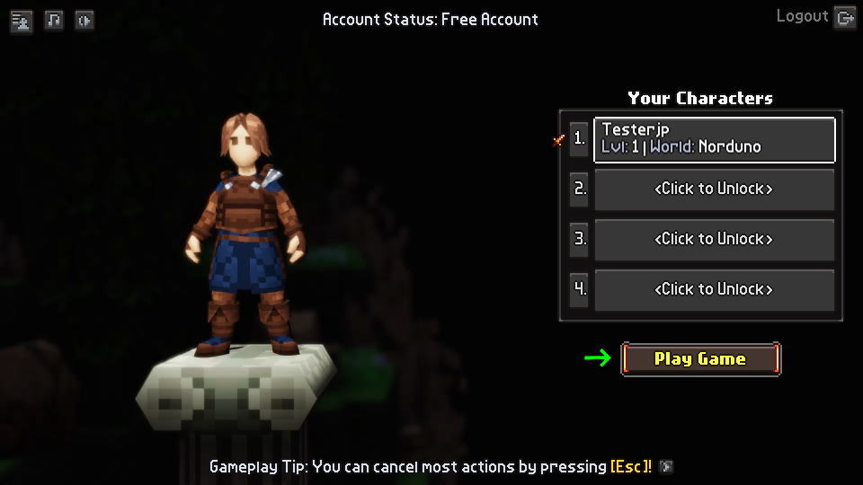キャラクターを作成したら、プレイするキャラクラーを選んで「Play Game」で開始します。
