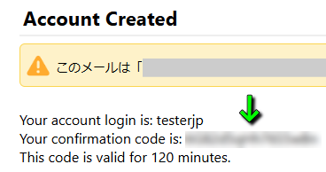 すると『Account Created』という件名でメールが届いており、図示した場所に認証コードがあります。