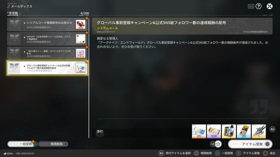 またメールボックスの中には、その他のキャンペーンによる報酬が届いている場合があります。