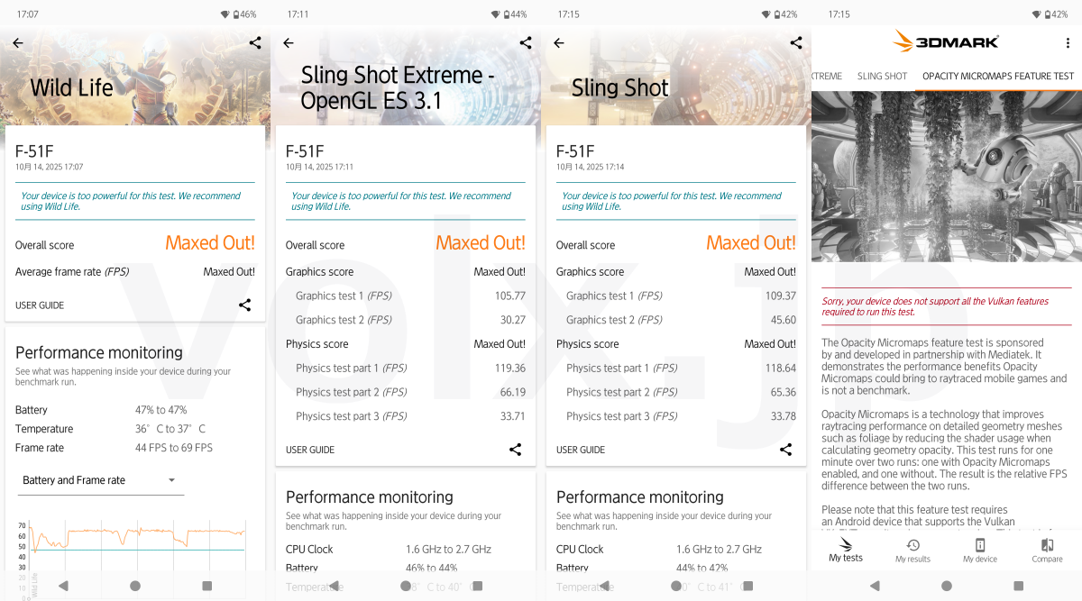 各ベンチマークのうち、Wild Lifeを含む4項目は測定不可でした。