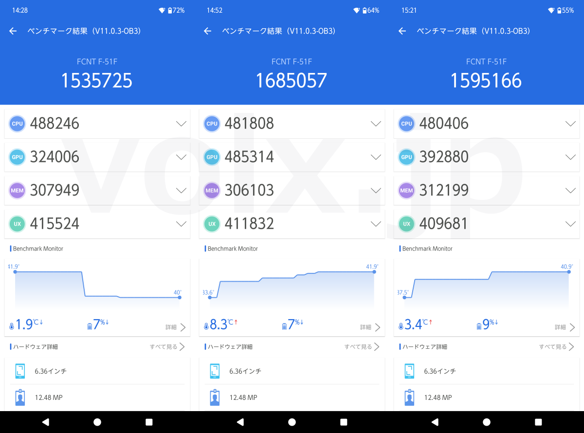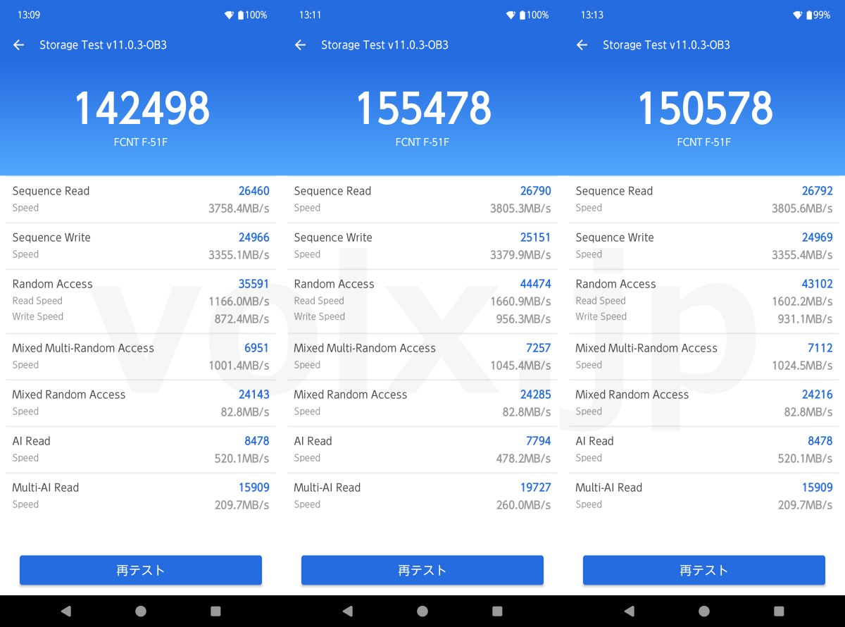AnTuTu benchmarkは総合ベンチマークを3回1セット、ストレージを同じく3回1セット行いました。