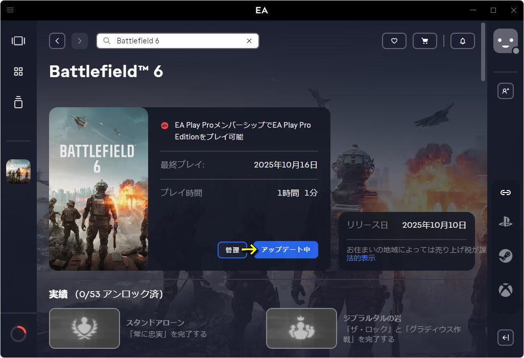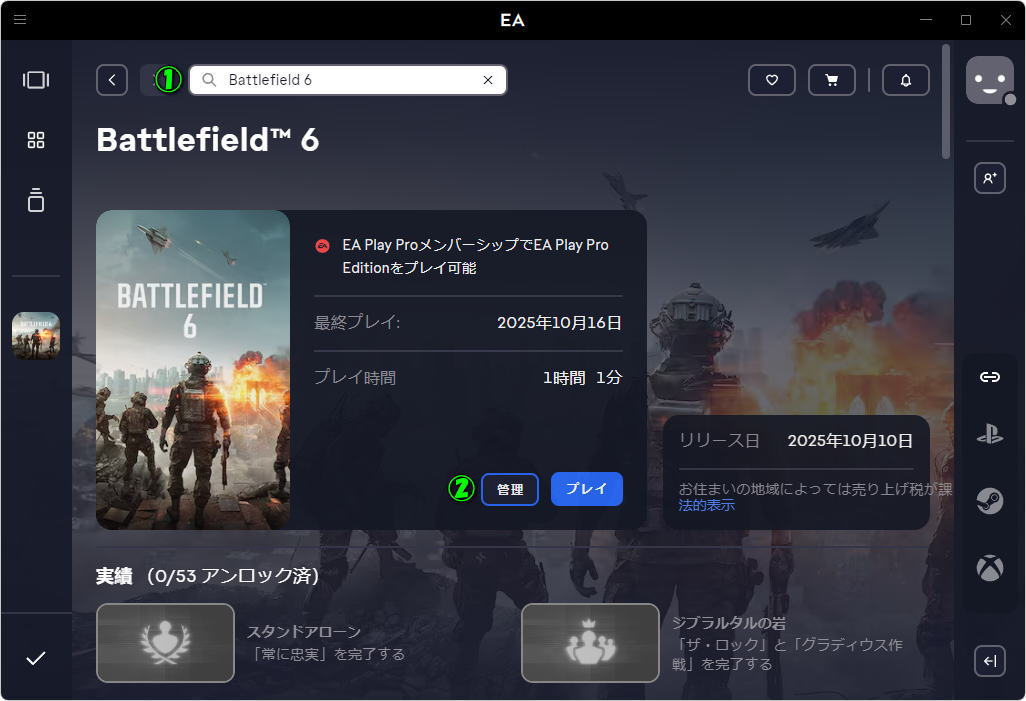 日本語字幕と英語音声を実現するには、EA appを起動して「Battlefield 6」で検索し「管理」に進みます。