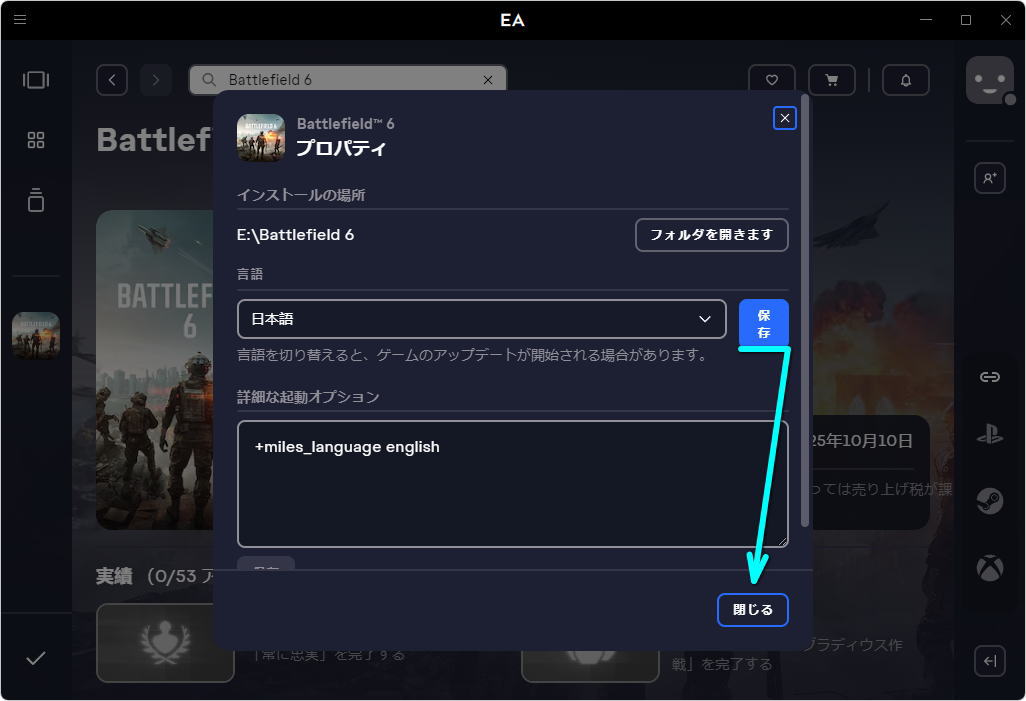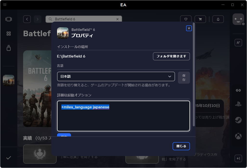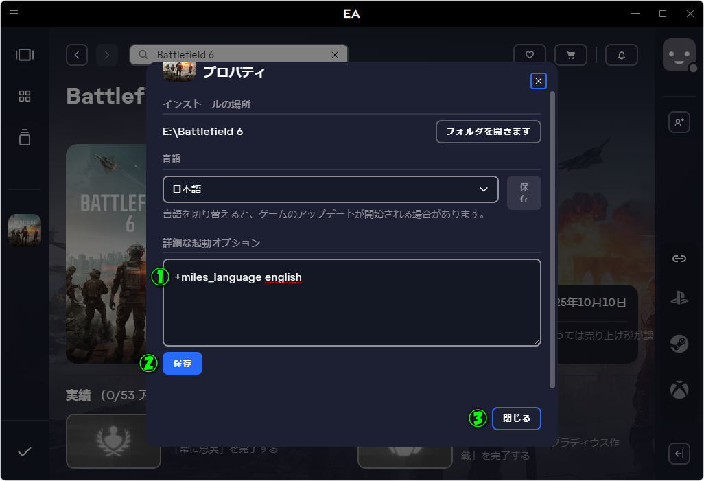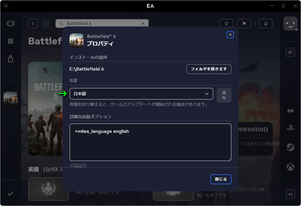 EA appの画面に戻ったら「プレイ」を押し、バトルフィールド6が英語音声になっているか確認します。