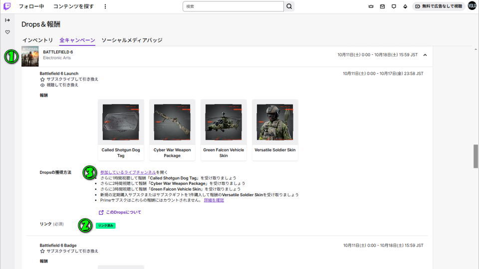全キャンペーンに移動したら『BATTLEFIELD 6』の項目①を開き、②の表示が「リンク済み」か確認します。