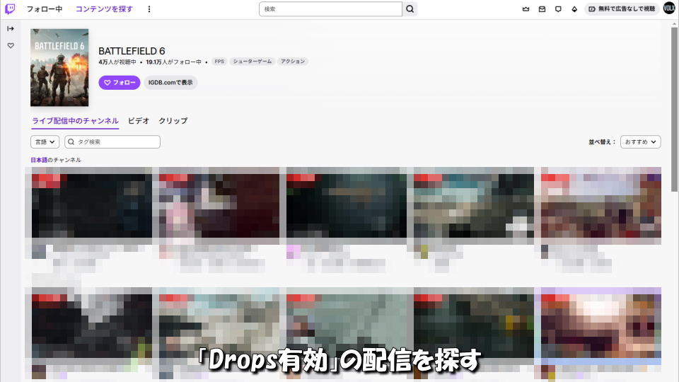 バトルフィールド6でTwitch Dropsを入手するには、リンク済みの状態で「BF6の対象チャンネル」を見ます。