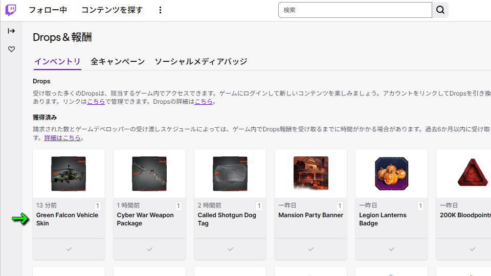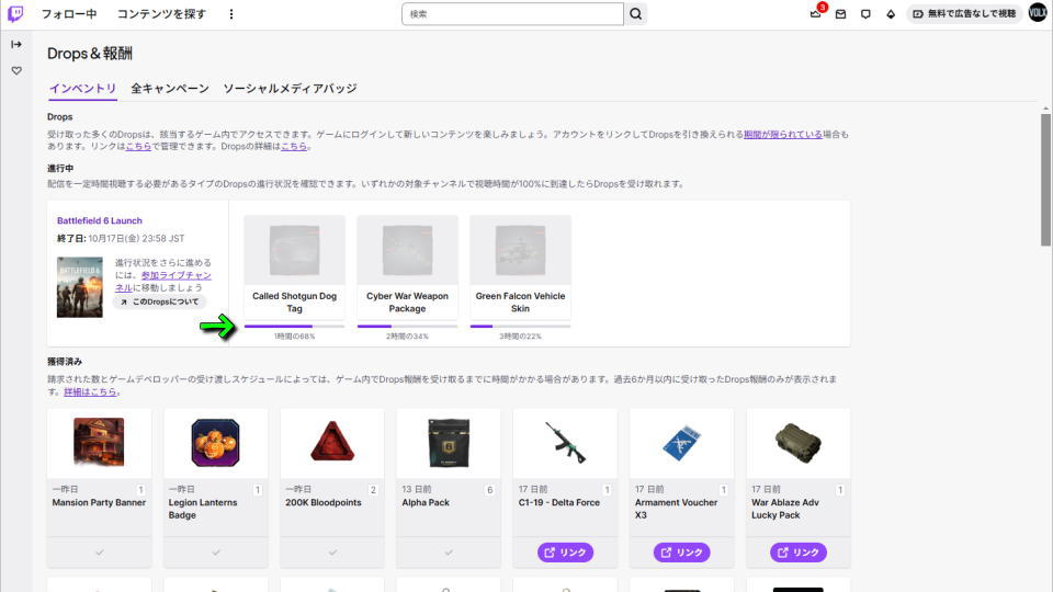 BF6の対象チャンネルで一定時間視聴すると、Twitchの「インベントリ」で獲得までの進行状況がわかります。