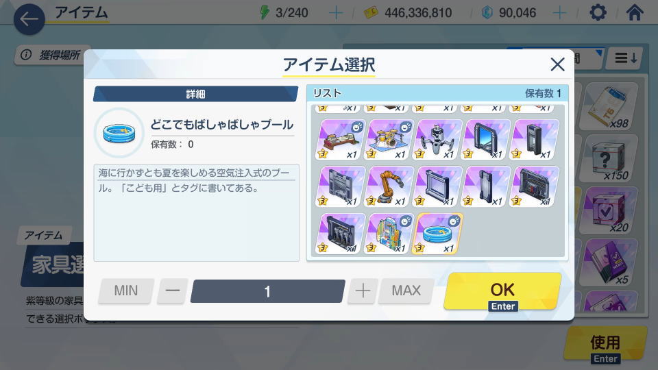 任意のレアリティの家具選択ボックス(ここでは紫)を選択したら、消費する素材を選択します。