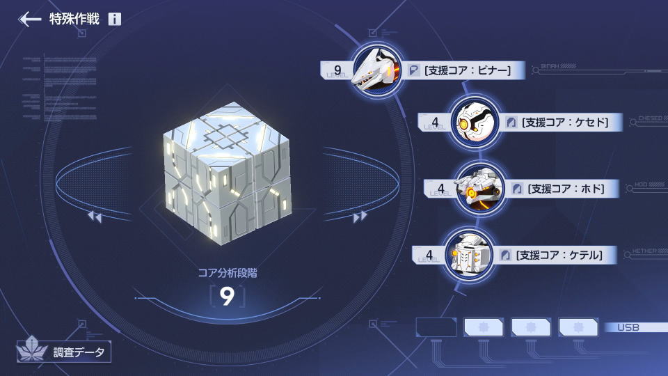 | 支援コア:ケセド | 預言者のコアを分析したデータで召喚したゴリアテが敵を砲撃 円形範囲内の敵に対して、大ダメージ(クールタイム30秒) |