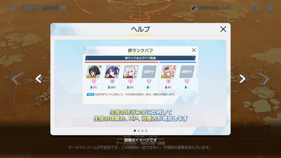 絆ランクボーナスとは、生徒の絆ランクに比例して「攻撃力 / HP / 治癒力」が増加するシステムです。