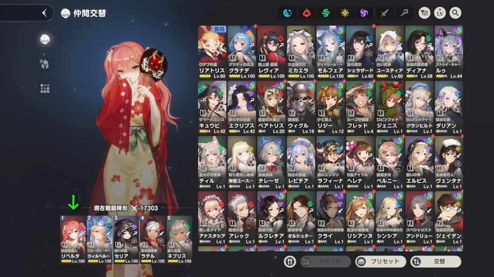 リベルタの外観をプレステージスキン「享楽探求者」に変えるには、仲間の画面でリベルタを選択します。