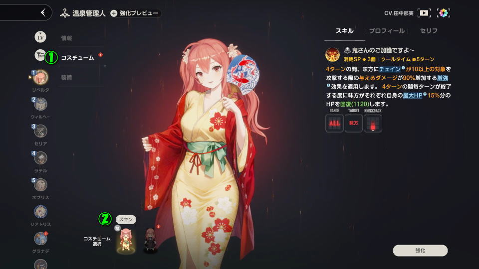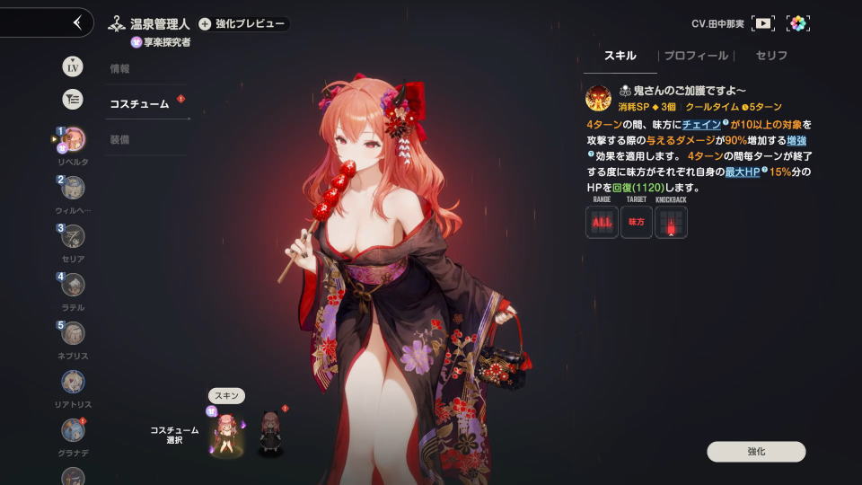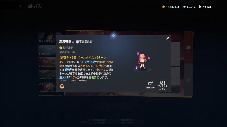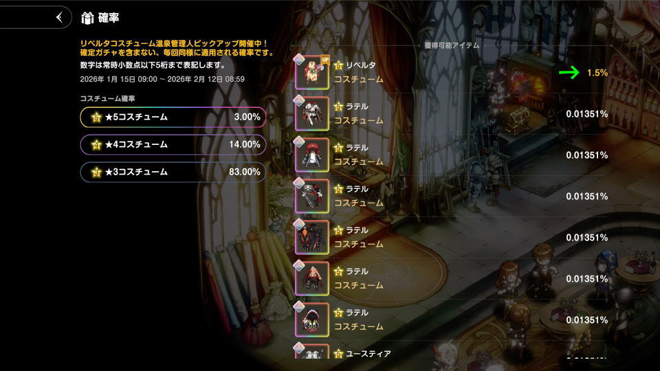 補足としてこのリベルタのコスチューム「温泉管理人」の抽選確率は「1.5%」となっています。