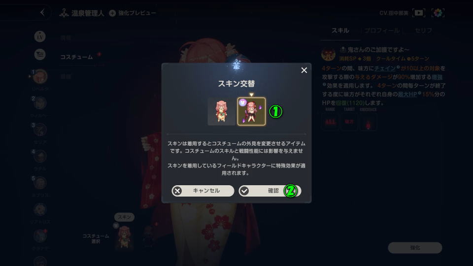 『スキン交替』の画面が表示されたら、右側の「享楽探求者」を指定して「確認」から確定します。