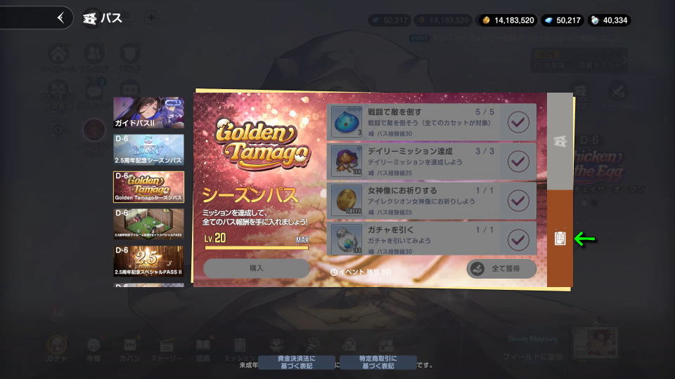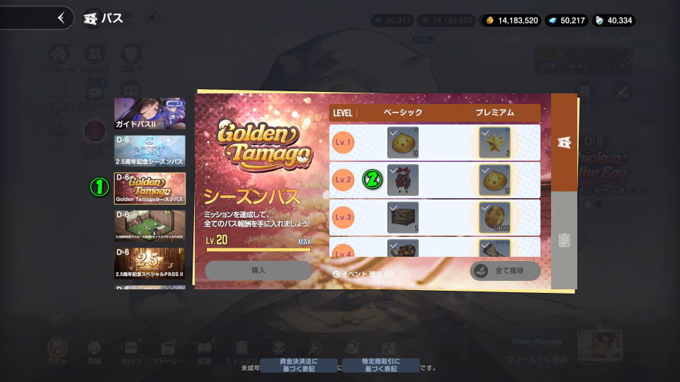 パスを開いたら外伝シーズンイベント「ゴールデンタマゴ(黄金の卵)」を選択し、Lv.2を見ます。