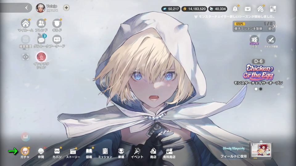 享楽探求者を『キャラクターとして』使うには、ロビー左下にある「ガチャ」に進みます。