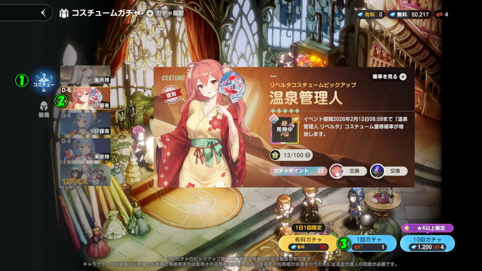 ガチャに移動したら「コスチューム」を選択し「温泉管理人」のガチャを引きます。