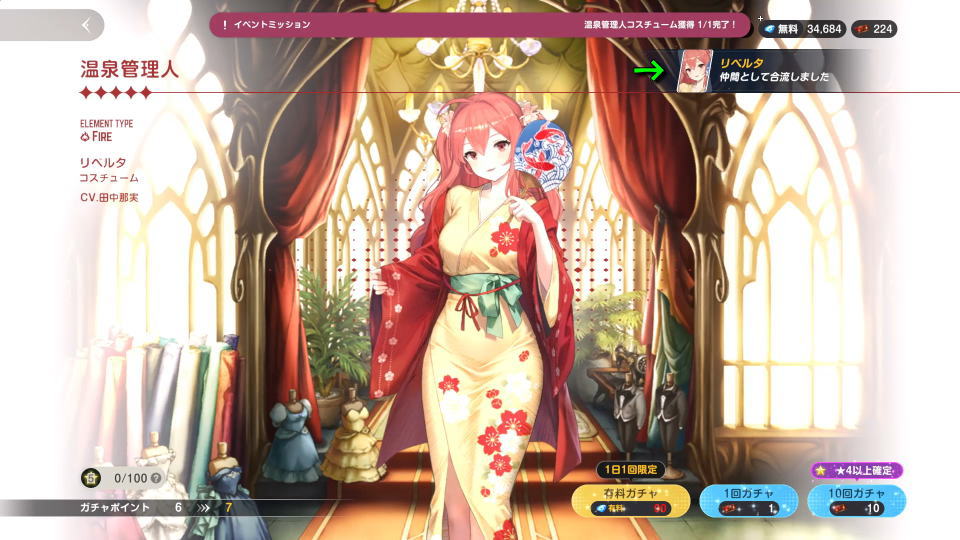 ガチャを引くと確率で「温泉管理人」が当たり、キャラクターの「リベルタ」が仲間として合流します。