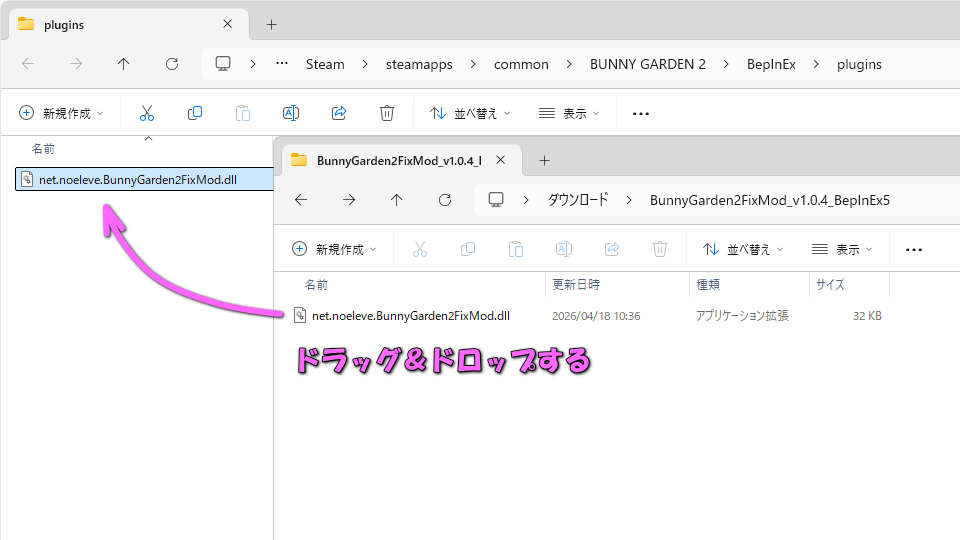 解凍したフォルダ内の「net.noeleve.BunnyGarden2FixMod.dll」を、下記ディレクトリの同ファイルに移動します。