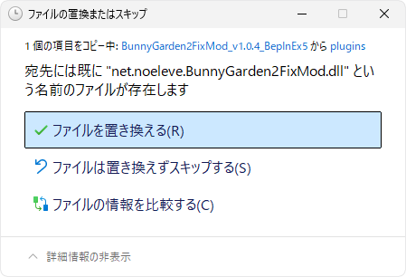 宛先には既に"net.noeleve.BunnyGarden2FixMod.dll"という名前のファイルが存在します』というメッセージが表示されたら「ファイルを置き換える」を選択します。