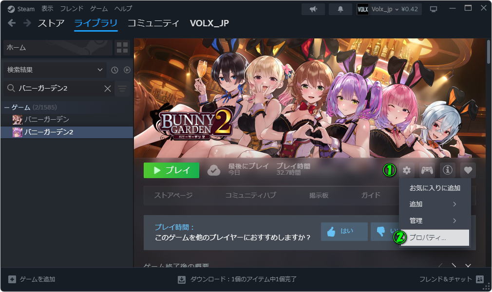 バニーガーデンの動作がおかしい、またはMODが上手く更新できない時はSteamを起動して「ライブラリ」の「設定」から「プロパティ」を選択します。