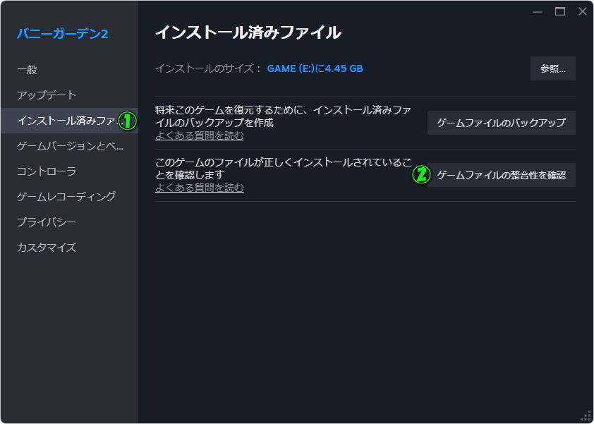 プロパティが表示されたら、左メニューから「インストール済みファイル」の中にある「ゲームファイルの整合性を確認」を実行します。