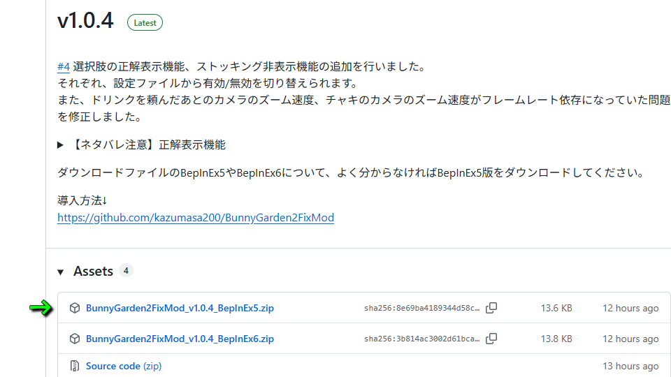 下記のリンク先から、最新の「BunnyGarden2FixMod」をダウンロードします。