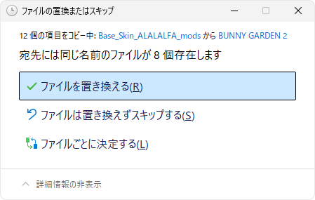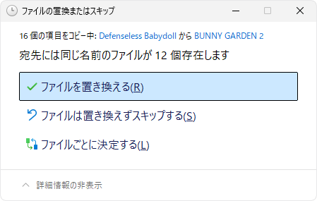 『宛先には同じ名前のファイルが12個存在します』と表示されたら「ファイルを置き換える」で確定します。