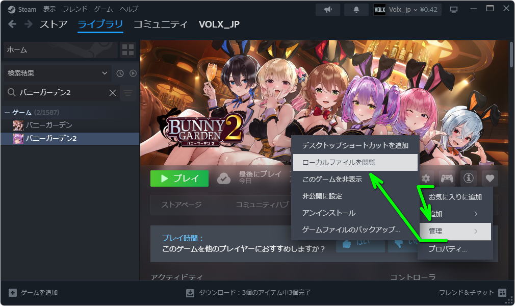 上記2つのファイルをダウンロードしたら、バニーガーデン2のインストール先を開きます。