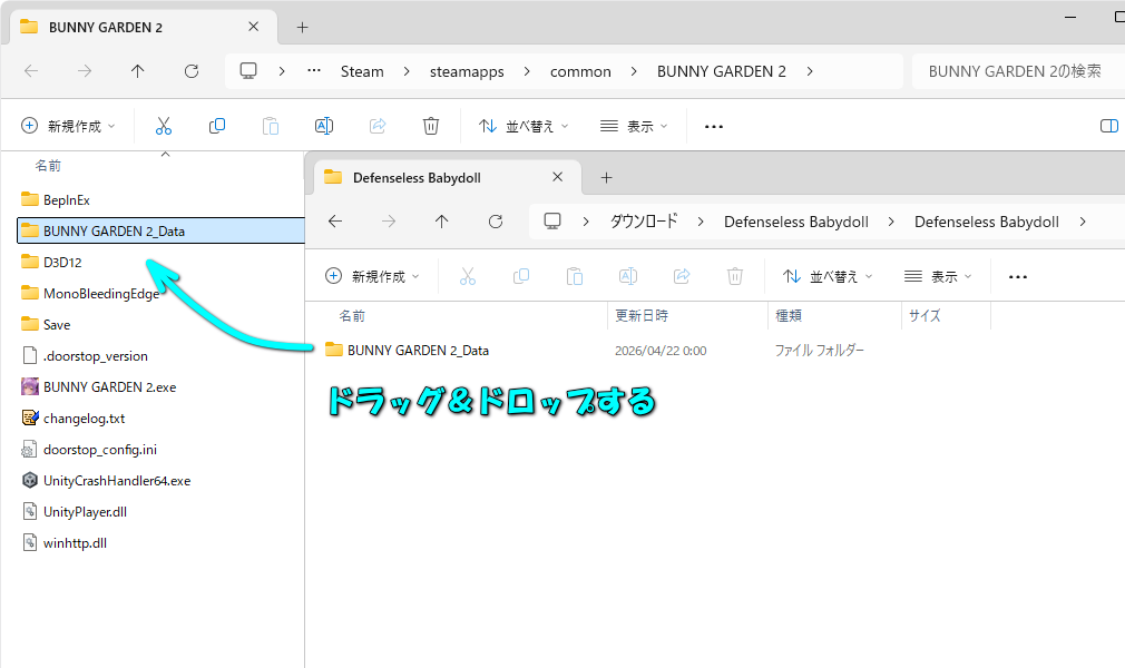同様に解凍したフォルダ内にある「BUNNY GARDEN 2_Data」を、バニーガーデンのインストール先にコピーします。