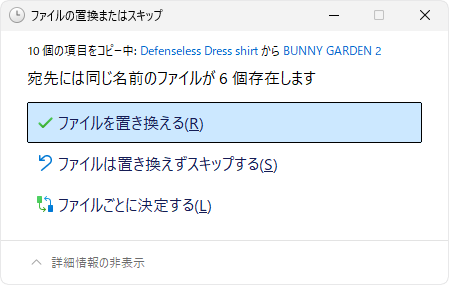 『宛先には同じ名前のファイルが6個存在します』と表示されたら「ファイルを置き換える」で確定します。
