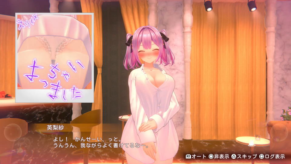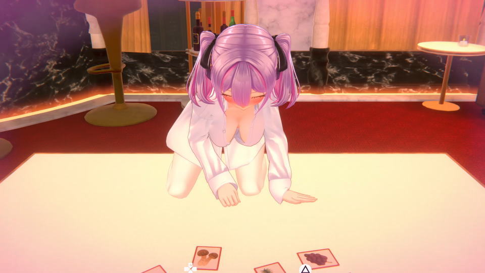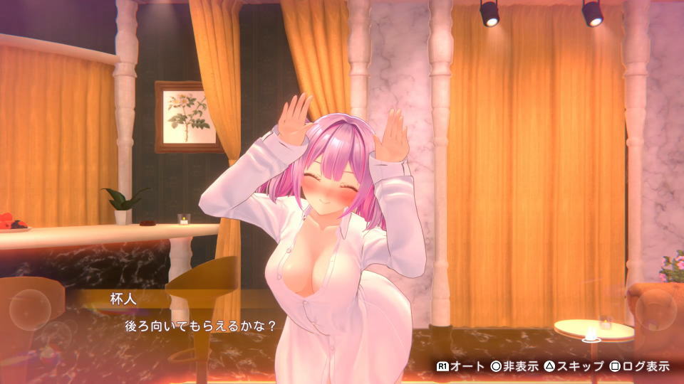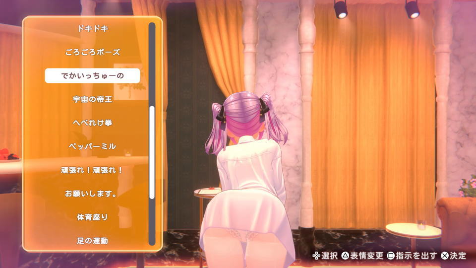 別の例として「チェキ撮影 × 酔い」に設定すれば、画面下部の「指示を出す」で後ろを向かせられます。