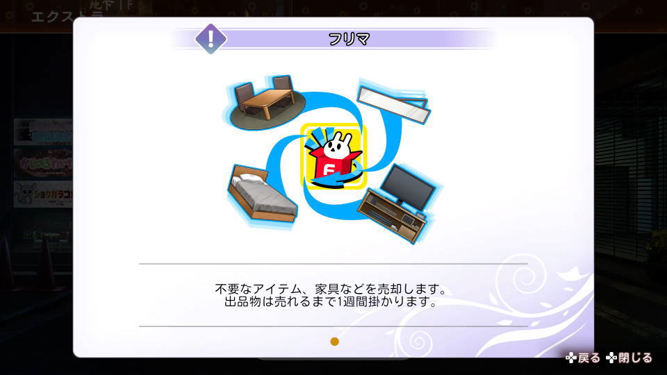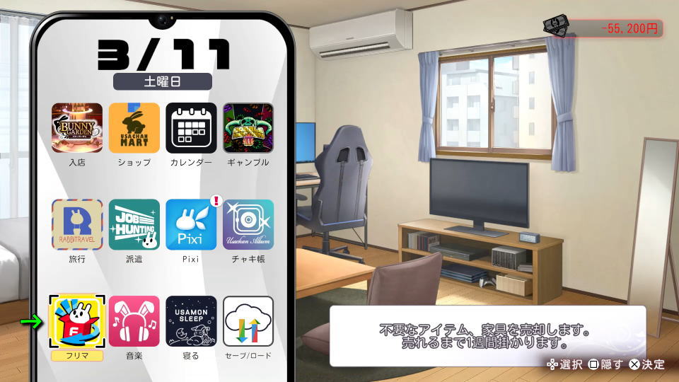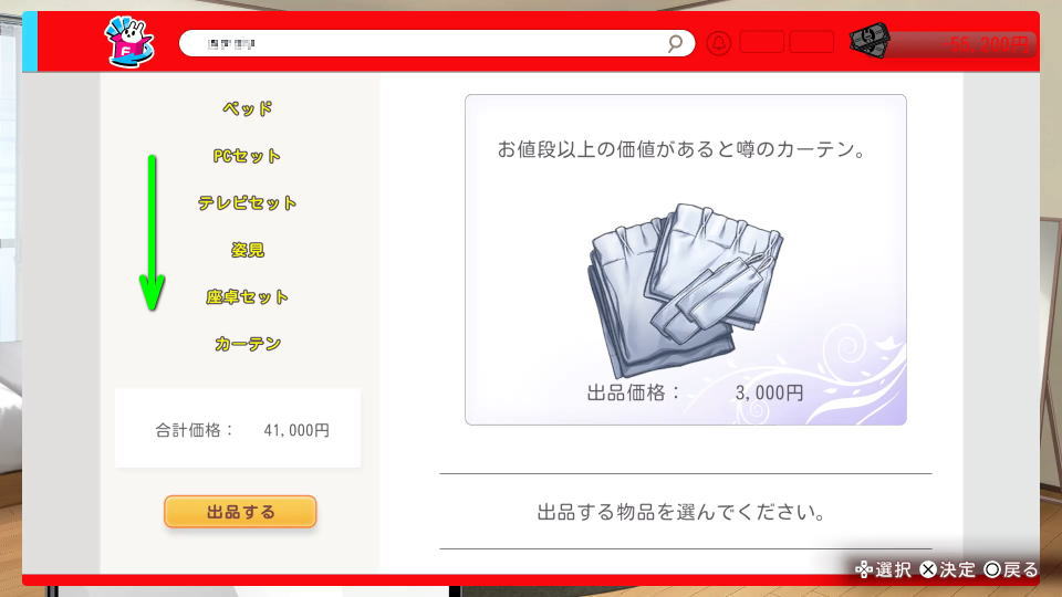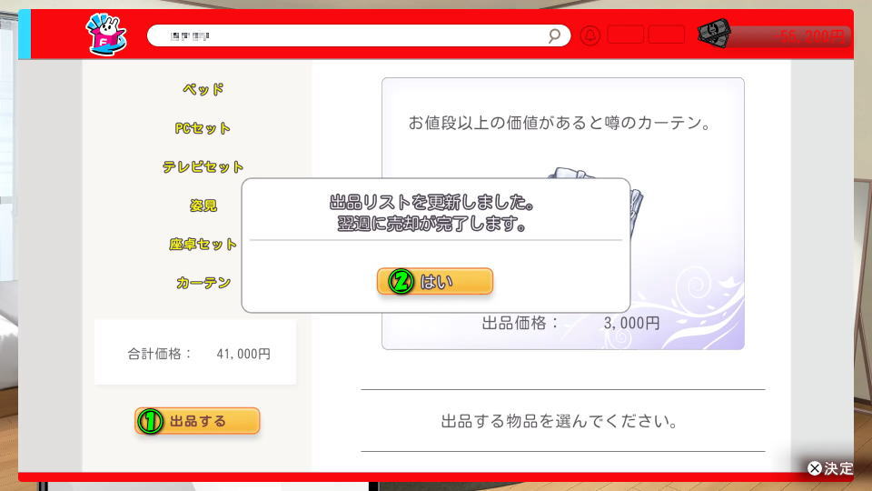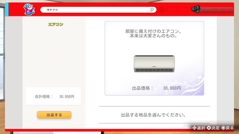 フリマを開いたら、処分したいアイテムや家具を選択します。