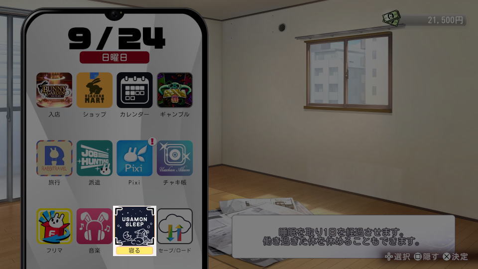 ショップでアイテムを買い占めたら「寝る」で時間を経過させます。