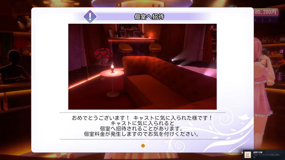 任意のキャストの好感度を上げ、同伴やアフターなどを行っていると個室に招待されるようになります。