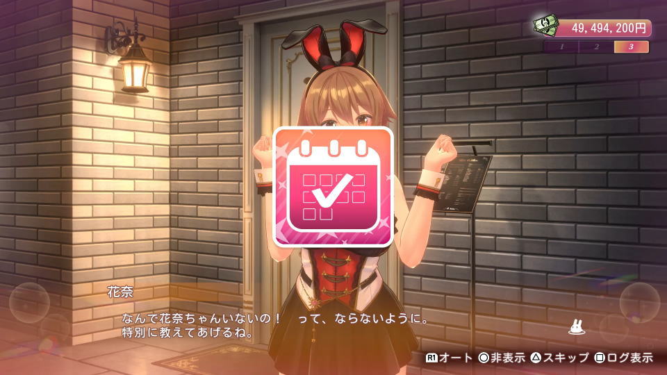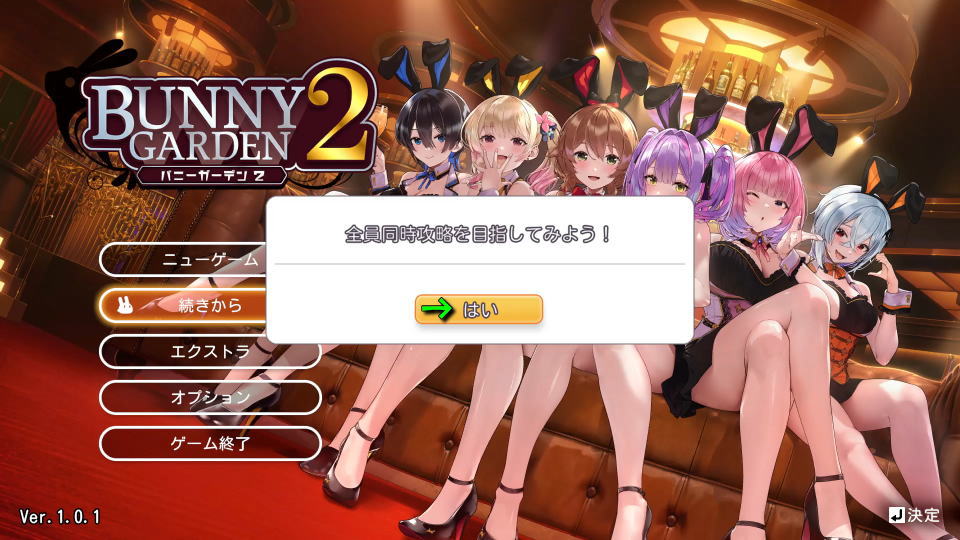 成金モードのメッセージを閉じると『全員同時攻略を目指してみよう!』と表示され、ハーレムエンドの存在が示唆されます。