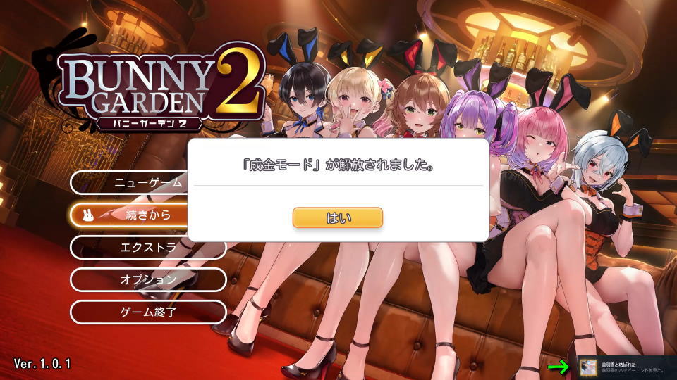 成金モードを解除するには、バニーガーデン2に登場する「全キャストの個別エンドを見る」が条件です。
