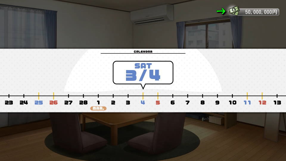 ゲーム開始日の3月4日には、所持金が「5,000万」になっています。