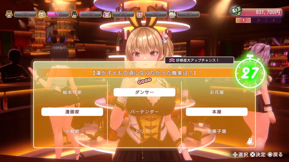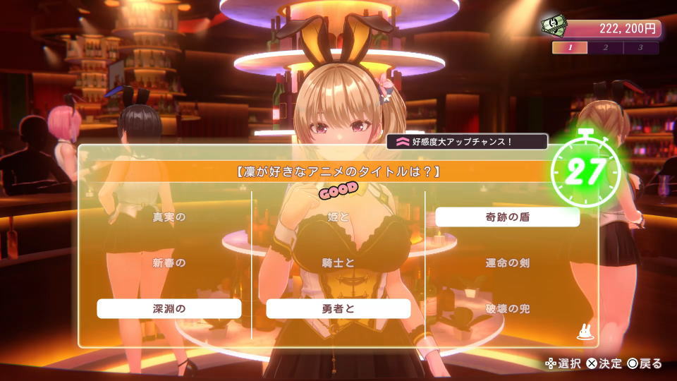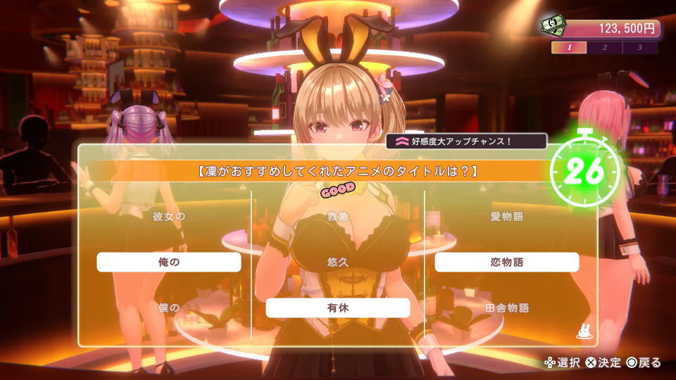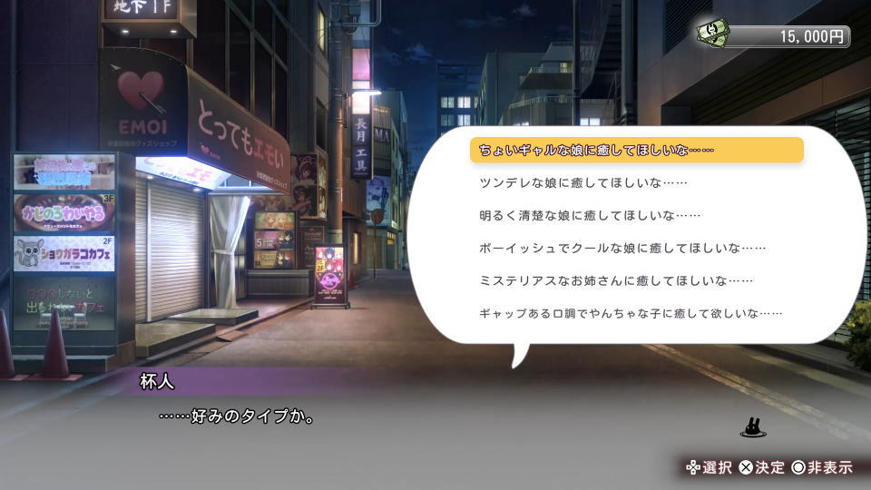 凛で最初に接客してもらうには、最初の選択肢で「ちょいギャルな娘に癒やしてほしいな……」を選びます。
