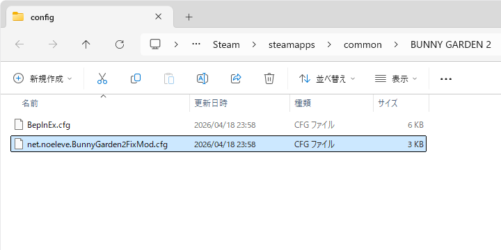 「BunnyGarden2FixMod」の「v1.0.3以降」を導入したら、下記ディレクトリの内部にある「net.noeleve.BunnyGarden2FixMod.cfg」をテキストエディタで開きます。