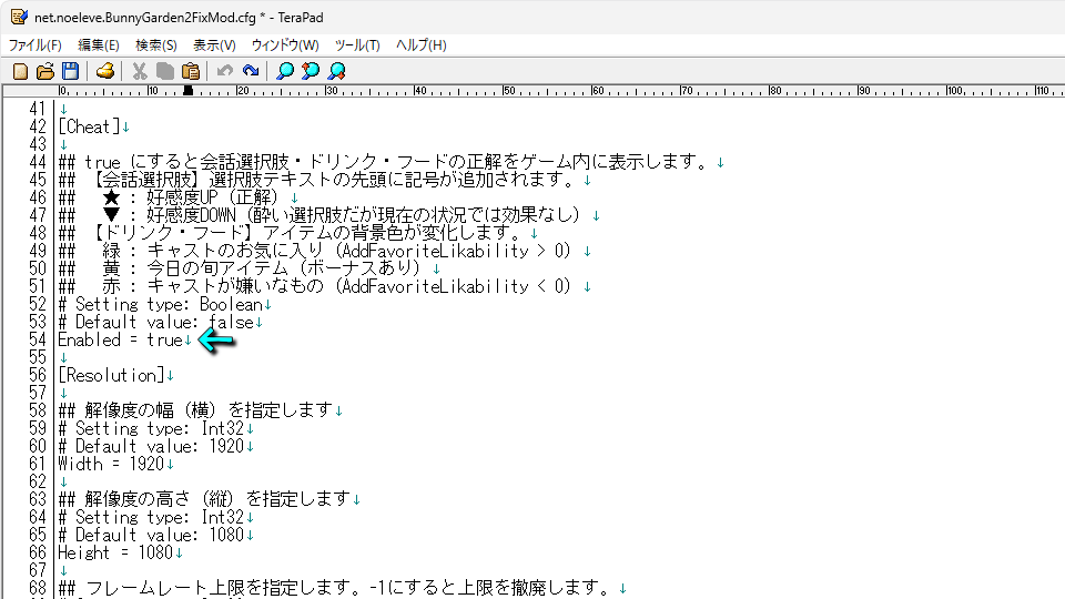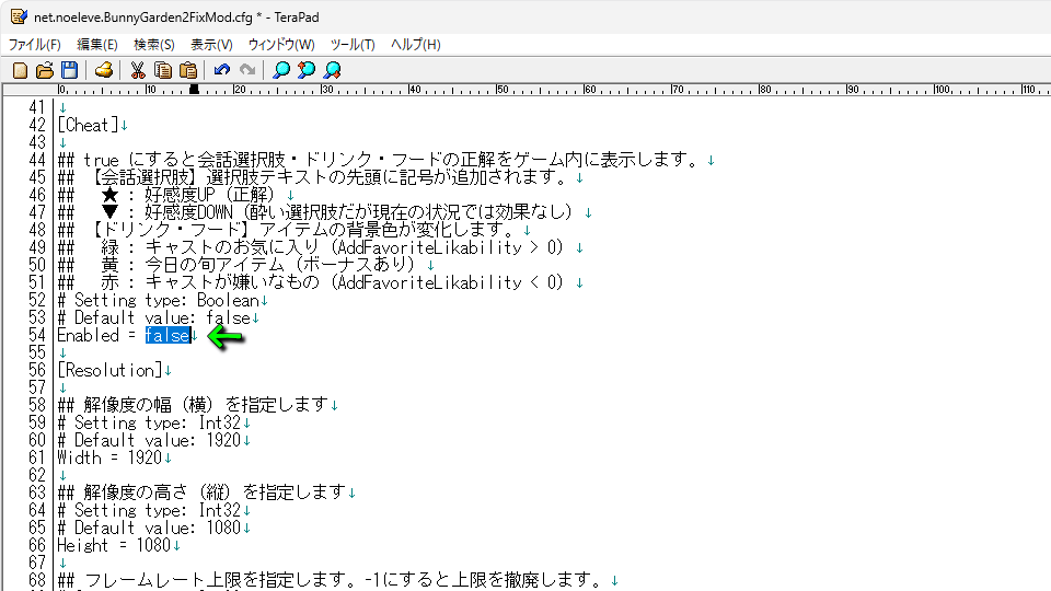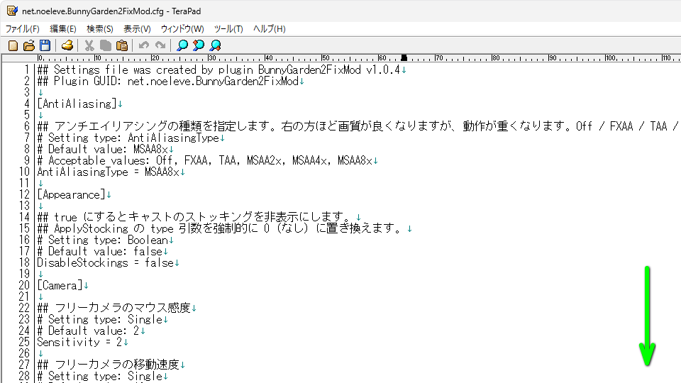 net.noeleve.BunnyGarden2FixMod.cfgを開いたら、画面を下にスクロールします。