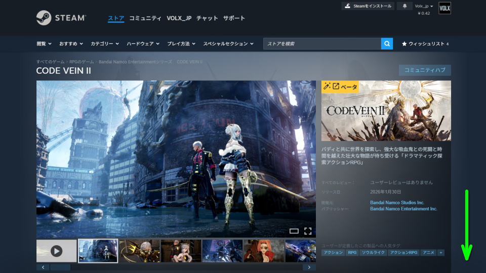 Steamの「CODE VEIN II」に移動したら、画面を下にスクロールします。