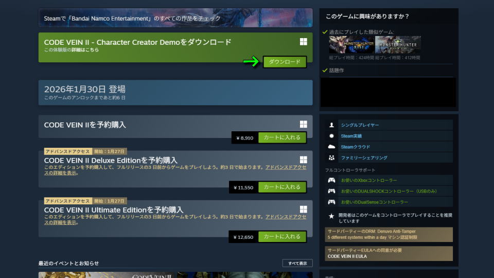 今回の記事ではこの「CODE VEIN II」を購入することなく、キャラクターを作成する方法を解説します。