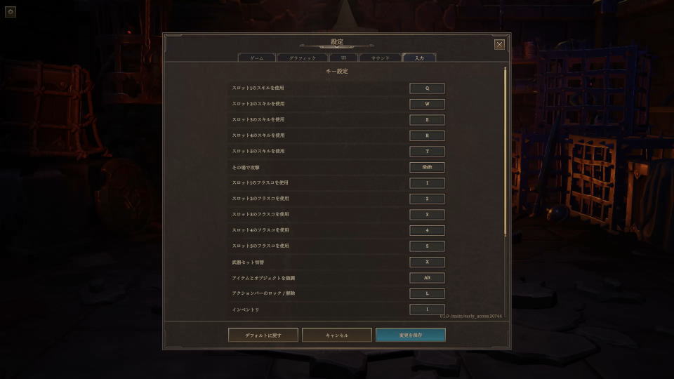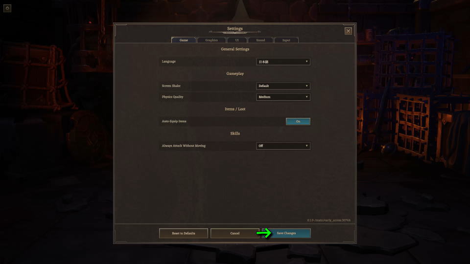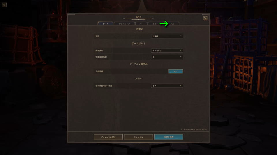 Crystalfallの操作を確認するには、日本語化済みのロビーの左上にある「設定」に進みます。