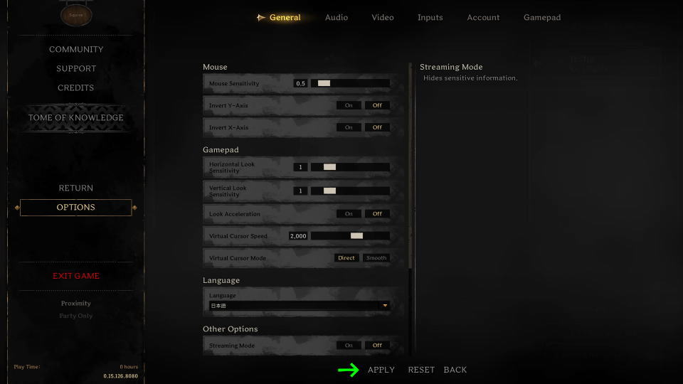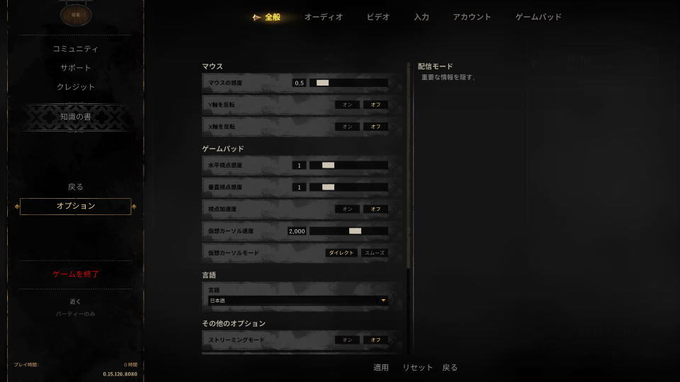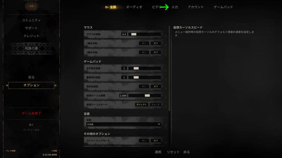 オプションに移動したら、Dark and Darkerをキーボードやマウスで操作する場合は「入力」を、コントローラーで操作する場合は「ゲームパッド」を選択します。