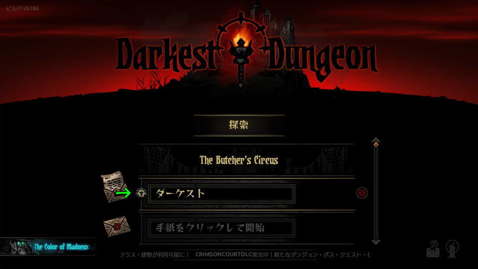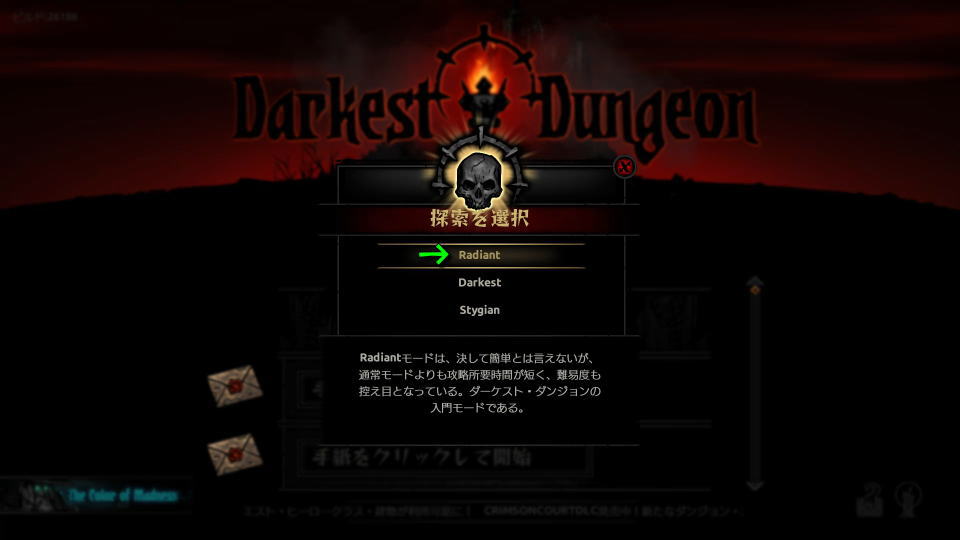 Darkest Dungeonの操作を確認するには、タイトルメニューの「探索」から「難易度選択」に進みます。