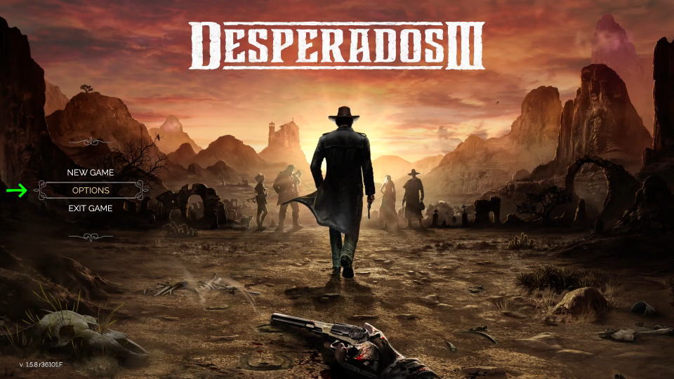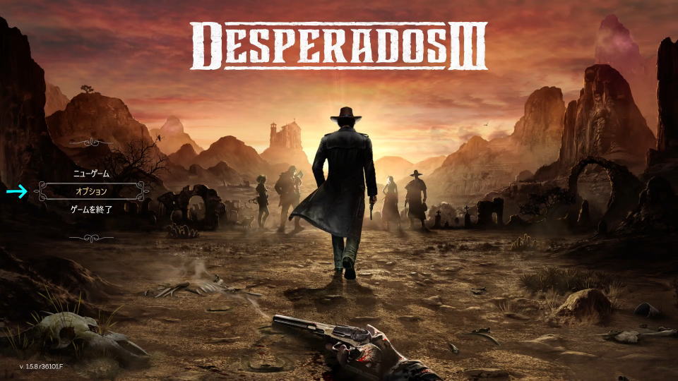 Desperados IIIを日本語化するには、タイトルメニューから「OPTIONS」に進みます。
