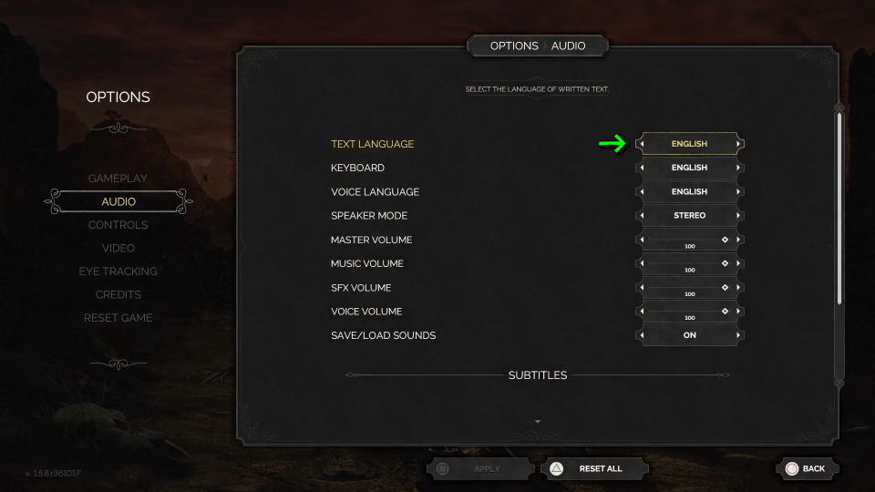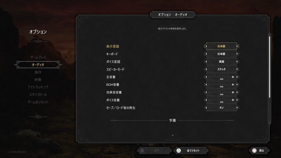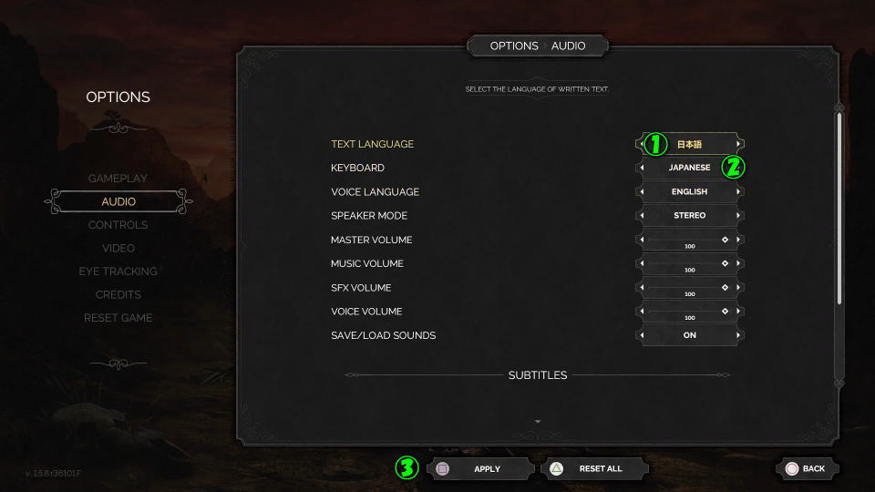 OPTIONSに移動したら「AUDIO」タブの『TEXT LANGUAGE』で「日本語」を選択します。