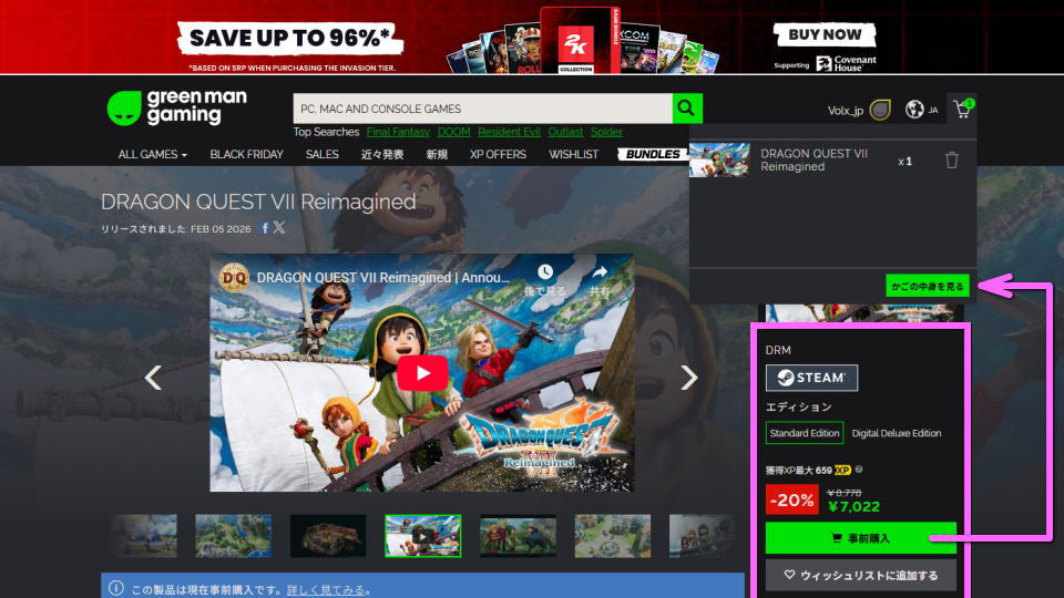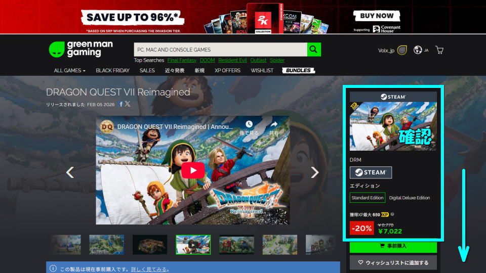 Green Man Gamingに移動したら「ドラゴンクエストVII Reimagined」を検索し、詳細ページに進みます。